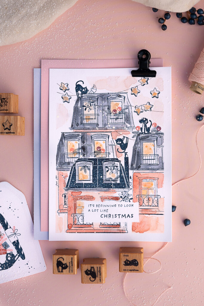 Kommt mit ins weihnachtliche Paris! Entdeckt, wie unsere Häuschen mit Aquarellfarben & Stempelliebe zum Leben erwachen.
